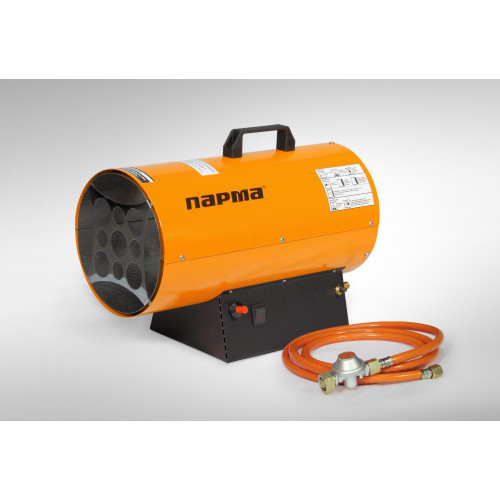 Воздухонагреватель прямого нагрева, работающий на газовом топливе. Топливо необходимо для получения горячей атмосферы в камере сгорания, а электроэнергия, подводимая к устройству, необходима для питания вентилятора, нагнетающего воздух, и для функционирования автоматики. Газовая пушка является простой и надежной конструкцией без дымохода, но горячий воздух и продукты сгорания из устройства поступают в помещение.