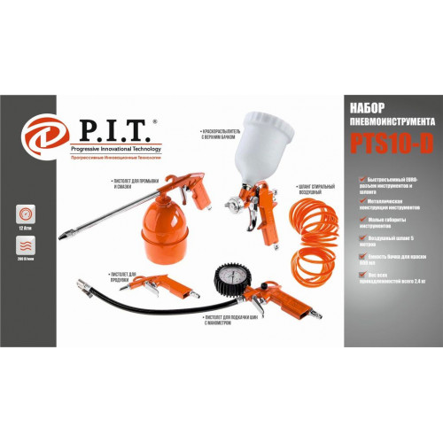 Набор пневмоинструмента P.I.T. PTS10-D:может использоваться для работы с компрессором разной производительности, при проведении покрасочных работ либо продувки различного оборудования. В комплект входит краскораспылитель, пистолет для подкачки, продувочный пистолет и 5 метровый шланг. Набор удобен для домашнего использования, поскольку позволит выполнить целый ряд работ требующих подачи сжатого воздуха, на садовом участке.